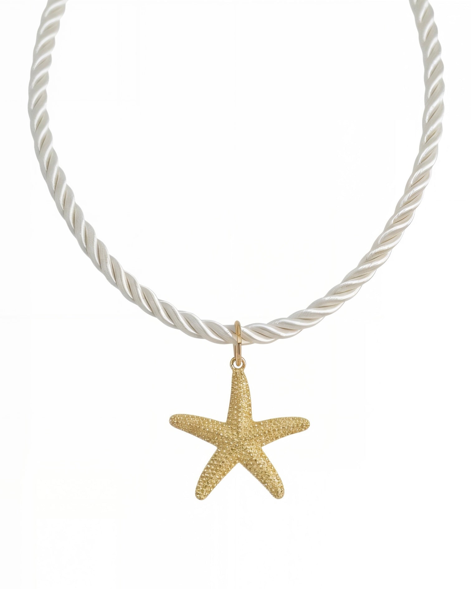 A textured gold starfish pendant on a silky rope choker- this piece brings full-on beach glam!