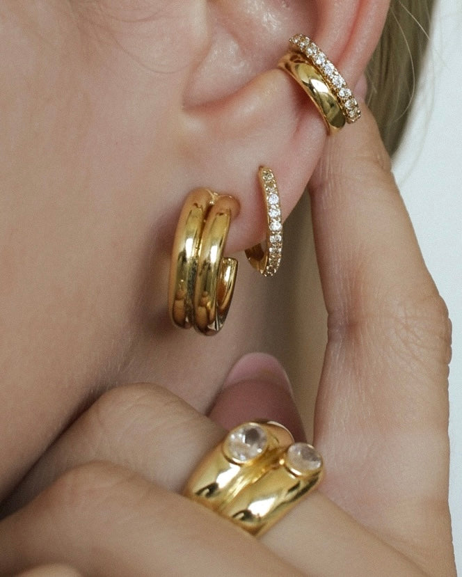 Double the hoops, double the style. These chunky, polished gold earrings are a twist on the everyday classic. They're perfect for dressing up your basics or elevating your evening look- no effort required.