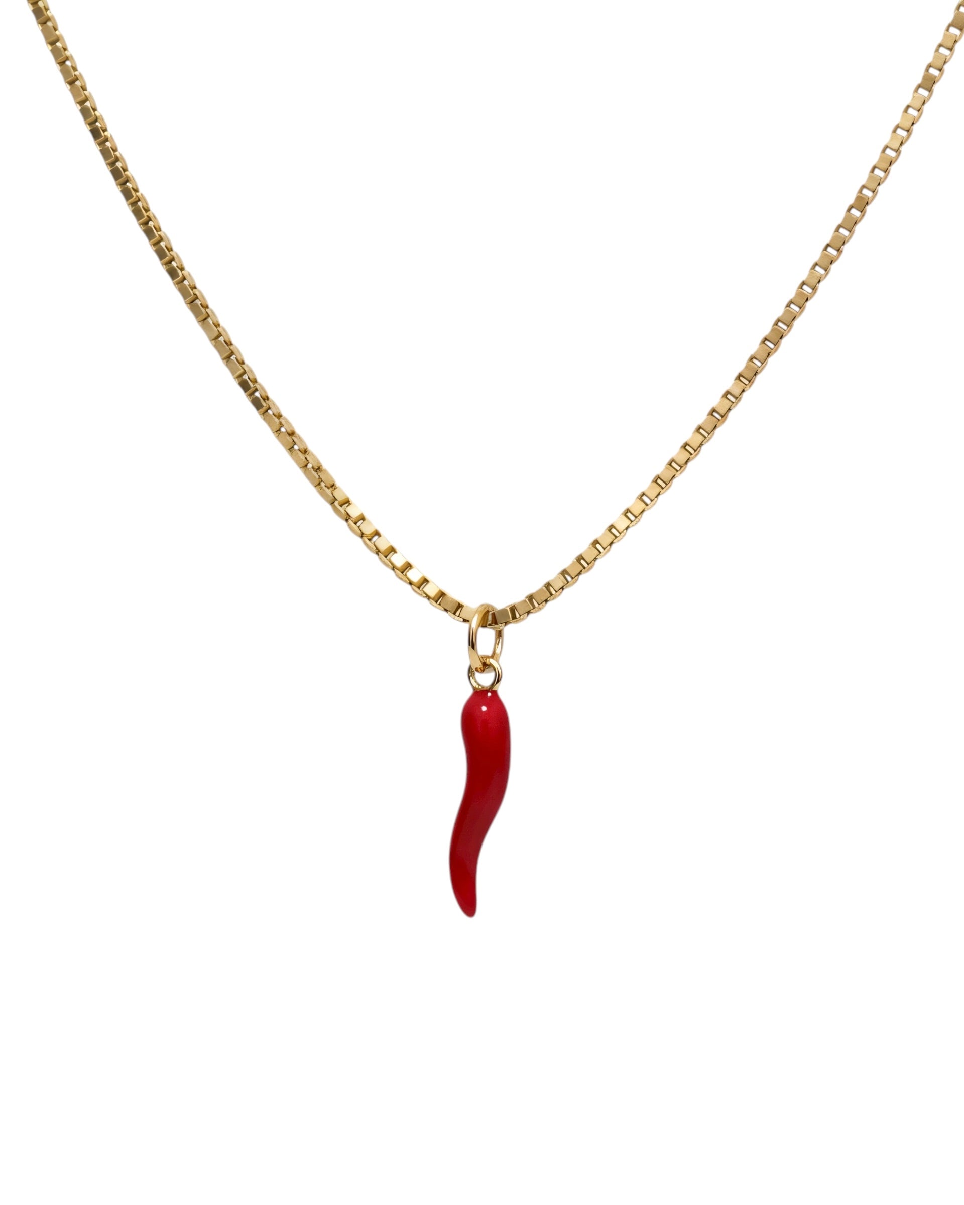 A bold pop of red meets luxe gold. This Italian horn pendant necklace is equal parts chic and protective, made to layer or stand alone.