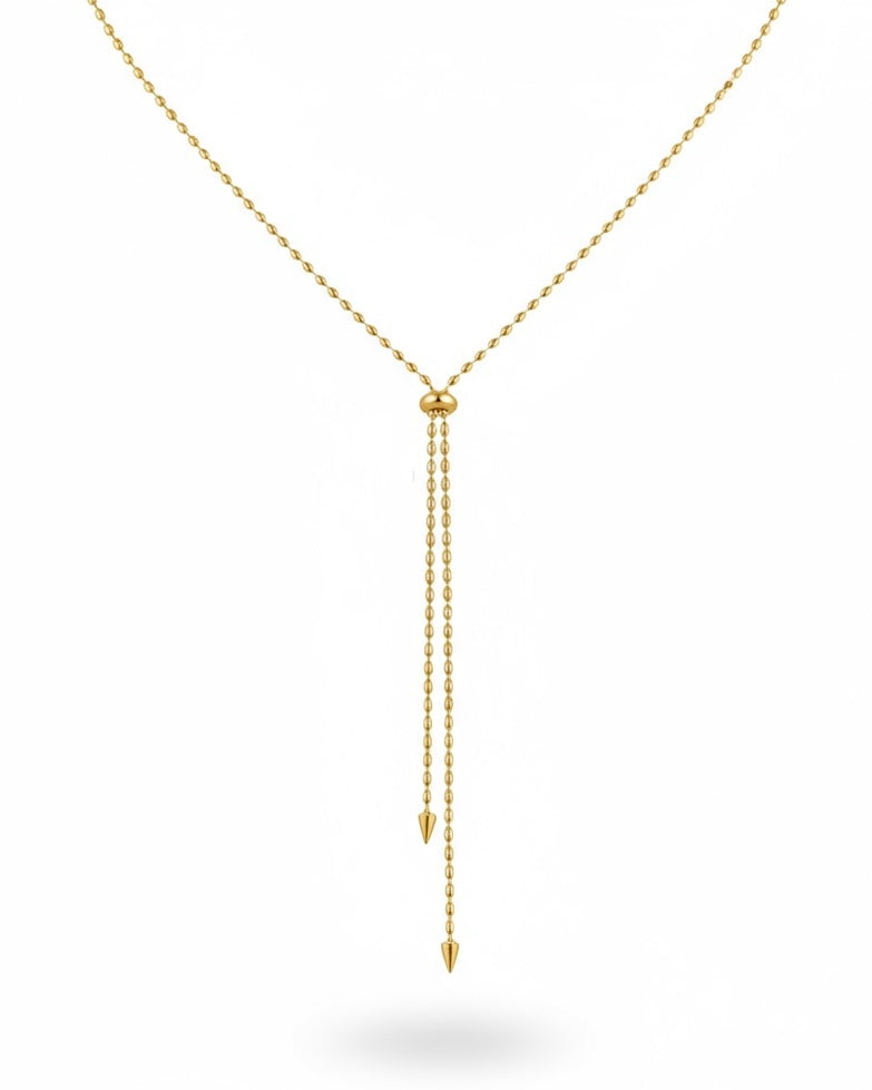 A sleek chain with an adjustable slide, finished with two cone-shaped drops for just the right amount of edge. Crafted in waterproof, tarnish-resistant gold tones stainless steel so it stays as polished as your look.