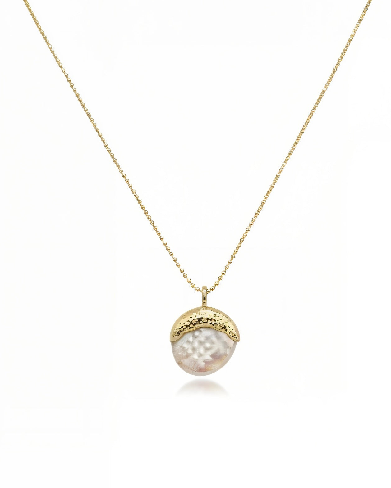 A little piece of the sea, wrapped in gold. This necklace features a natural pearl coin tucked into a textured gold shell, giving it a dreamy, beachy feel you can wear year-round. Effortless, elegant, and just the right amount of shimmer.