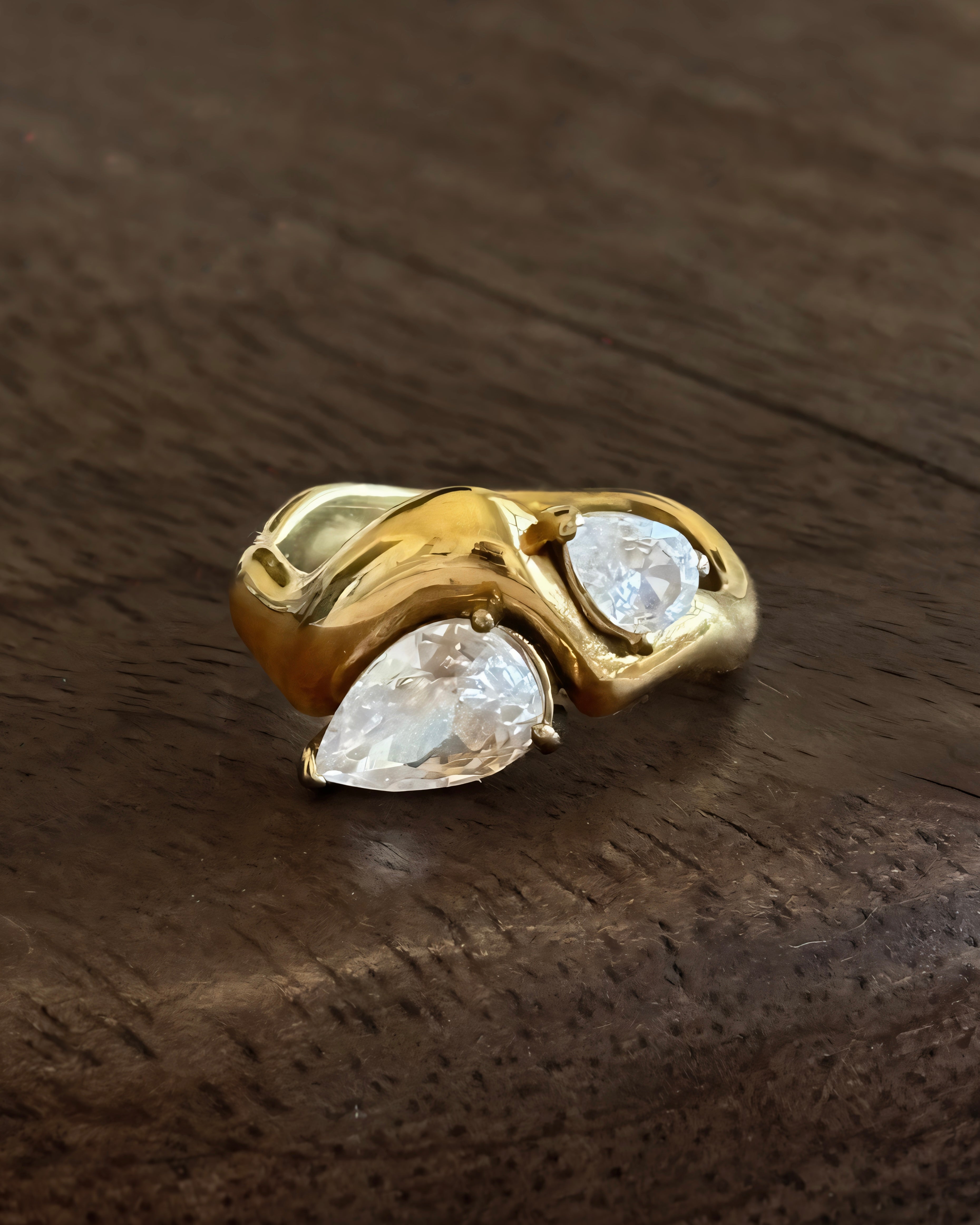 The Twin Light Ring features a fluid gold band set with one pear-cut and one round crystal, designed to catch the light from every angle. Its organic shape gives it a sculptural feel while the stones add just the right amount of shine.