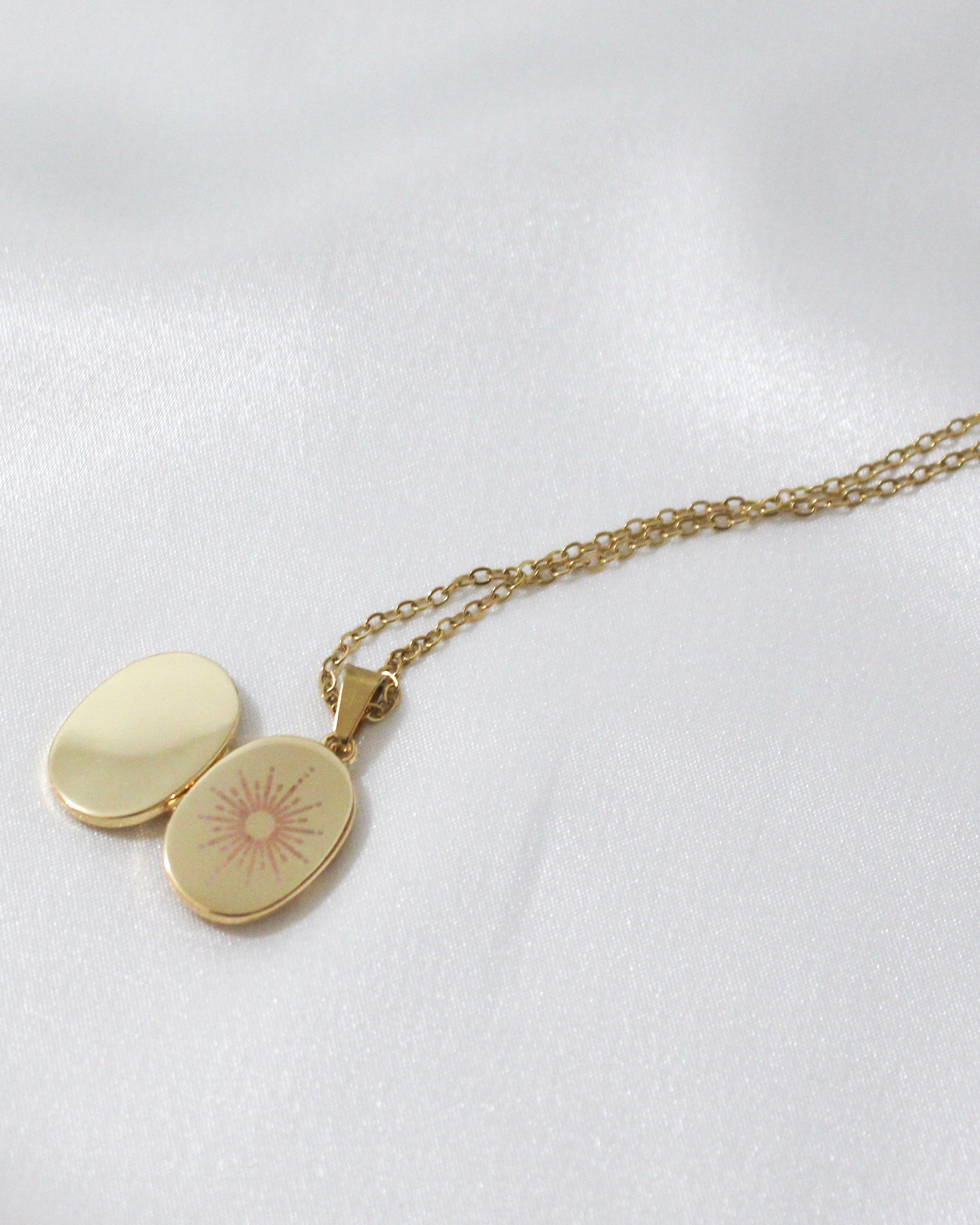 A delicate gold oval locket etched with a radiant sunburst design, this piece is both timeless and meaningful. The locket opens to hold two photos or tiny keepsakes, making it the perfect blend of elegance and sentiment.